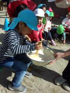ぐりとぐらにも食べさせてあげたい、という事で園庭にカステラを置いておきました。食べてもらえるか楽しみにしている子どもたちでした。