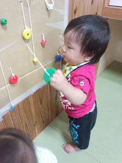 0歳児たんぽぽ組で、引っぱるあそびをしました。